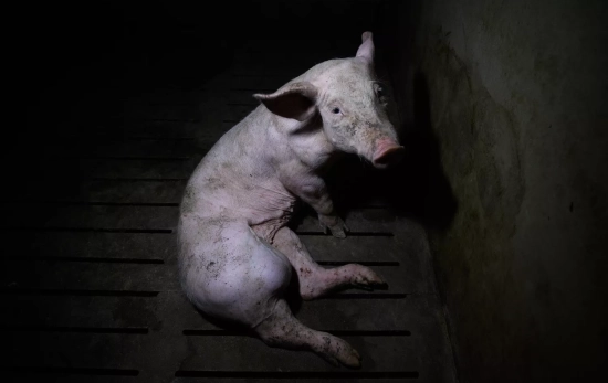 Cerdos con gangrena, heridas abiertas y deformaciones padeciendo desnutrición y hacinamiento extremo. Cadáveres por el suelo e incluso cerdos siendo devorados vivos.