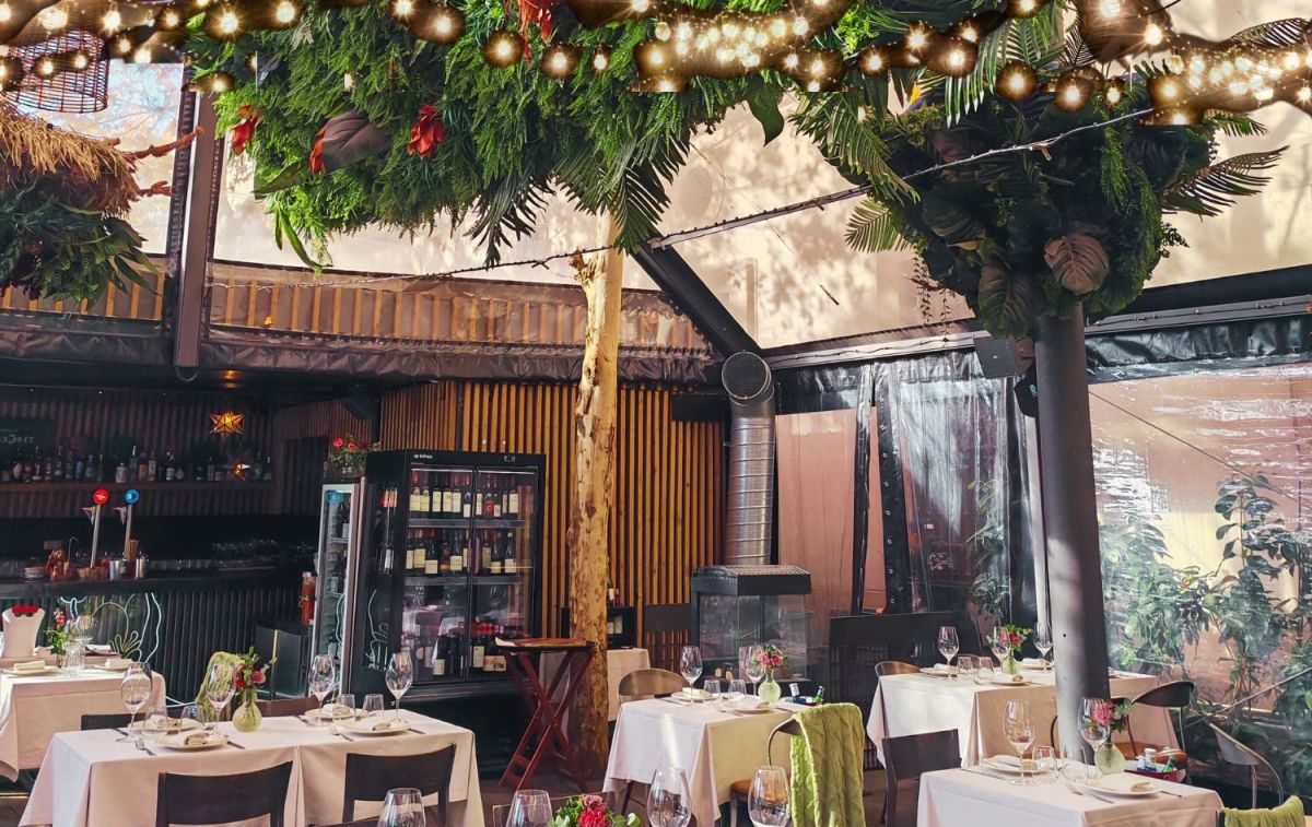Lleno de plantas, con diseño tipo invernadero, puertas correderas y mesas al aire libre, el jardín se muestra ante el cliente como un sitio encantador para los que les encanta tomarse un vino bajo una cortina de luces cálidas.