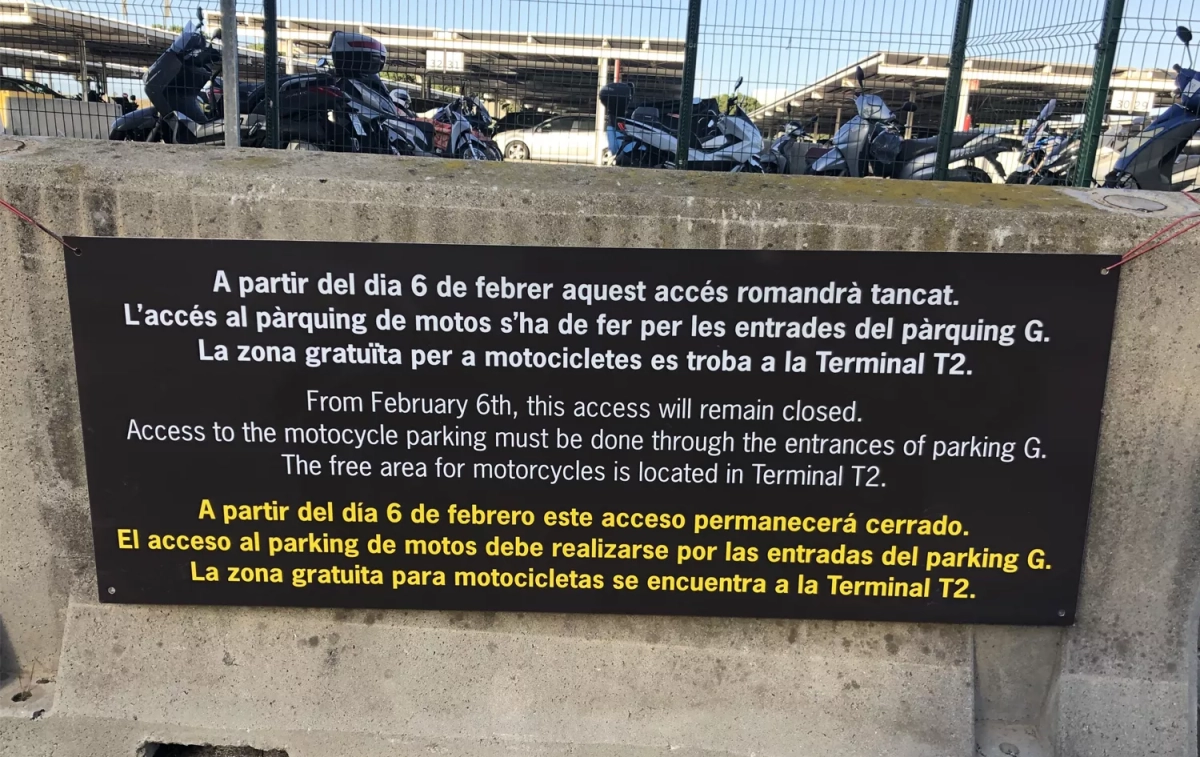 "A partir del 6 de febrero este acceso permanecerá cerrado. El acceso al parking de motos debe realizarse por las entradas del parking G. La zona gratuita para motocicletas se encuentra a (en) la Terminal T2", se puede leer en el cartel de bienvenida de Aena en la barrera de hormigón que bloquea el acceso.