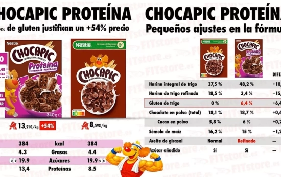 Um dos casos mais llamativos que recolhe o estudo é o lançamento da versão "protein" de Chocapic, um cereal historicamente orientado ao público infantil. A simples vista, a mudança de imagem e o ênfase na proteína podem levar ao consumidor a pensar que se trata de um produto mais equilibrado. No entanto, os dados nutricionais desmentem essa percepção: mantém exactamente o mesmo conteúdo de açúcar que a versão original, um 19,9%, uma cifra especialmente elevada para um alimento destinado a meninos. Acrescentar proteína, sublinha o relatório, não converte por si só a um produto em saudável se não se reduzem o açúcar ou as calorías.