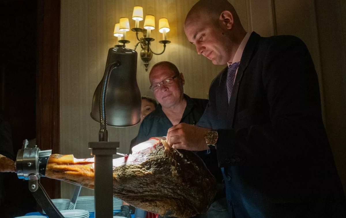 O momento cimeira da noite chegou da mão de José Gómez, quinta geração da família Joselito. Para uma ocasião tão especial, trouxe desde Guijuelo (Salamanca) uma peça única: um presunto vintage que levava madurando pacientemente desde o ano 2008. Um tesouro gastronómico que representa a filosofia da marca.