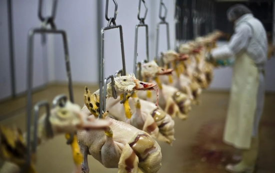 Os animais são sacados dos cajones e são pendurados das patas, cabeça abaixo, nuns ganchos que penduram do teto, "estando perfeitamente conscientes (e aterrorizados), se produzindo tentativas de fugida e aleteos bruscos que, em não poucas ocasiões, provocam o rompimento de seus patas ou de seus húmeros ao golpear suas asas contra a maquinaria. Por isso, alguns patos têm fracturas abertas em patas e asas".